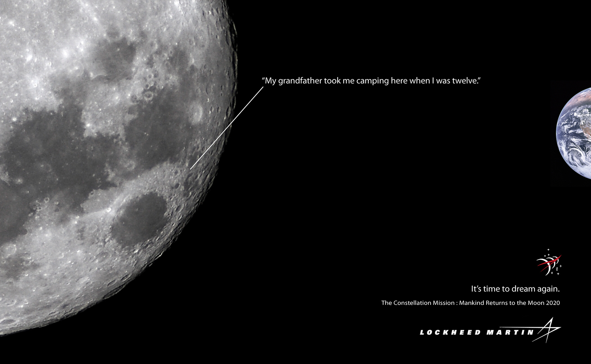 Airport and subway transit campaign (student work) to promote Lockheed Martin's contribution to the Constellation lunar project. The public is encouraged to envision a future where the moon is a destination for real people, not just astronauts; where their grandchildren will make special memories. A branded website would allow the public to explore the Lockheed Martin vehicles and plan their future experiences on the moon.